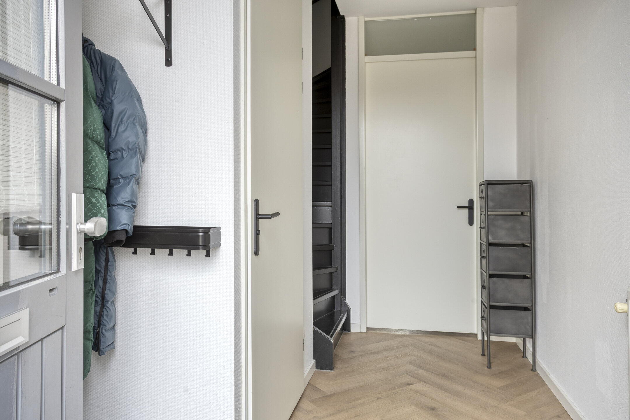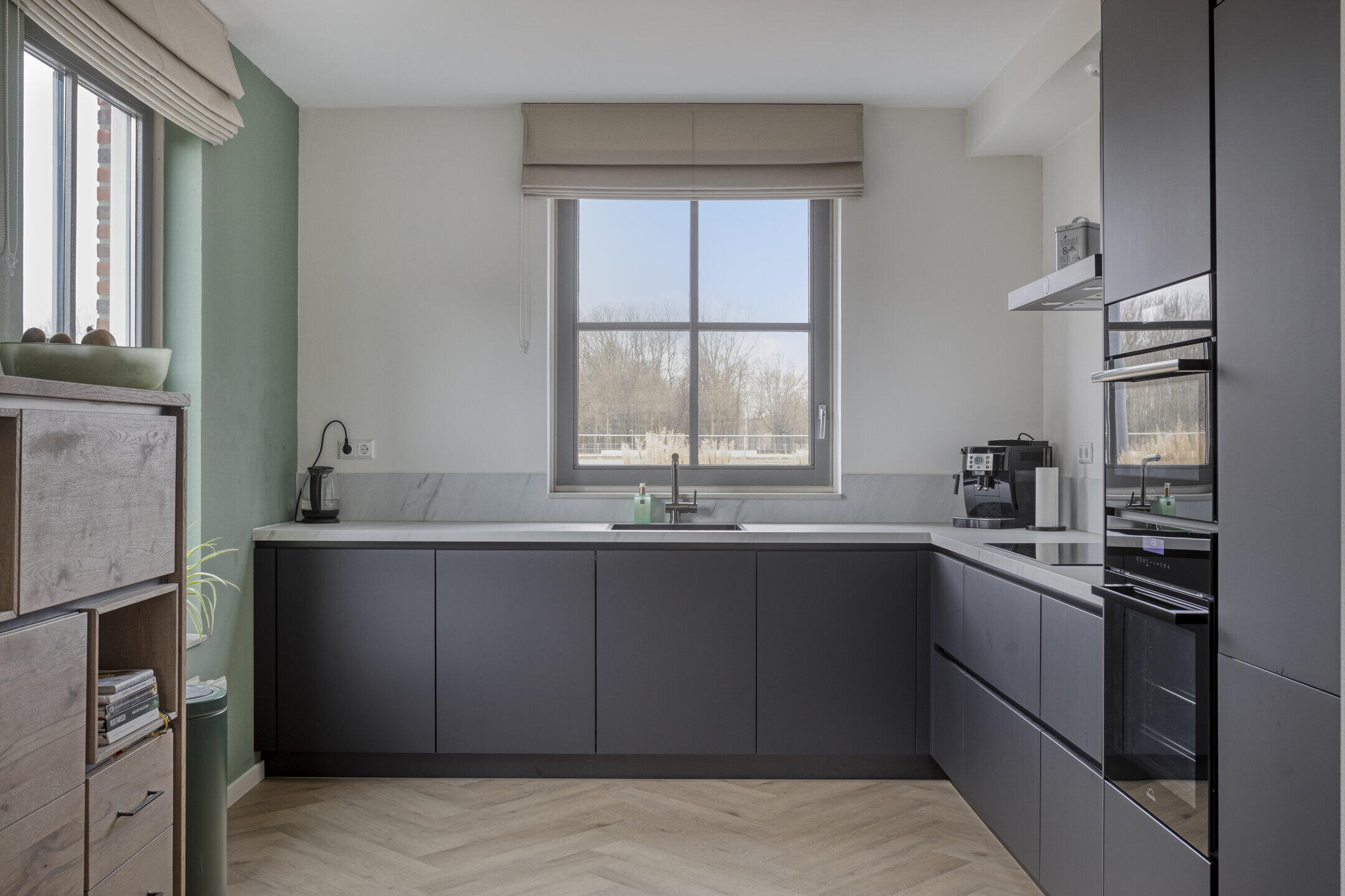 Via de entree met toiletruimte, meterkast en trapopgang bereik je de royale, tuingerichte woonkamer met een fraaie pvc-vloer. Aan de voorzijde van de woning bevindt zich de in 2022 vernieuwde, matzwarte leefkeuken, uitgevoerd in een praktische L-opstelling. De keuken biedt veel kastruimte, is uitgerust met diverse moderne inbouwapparatuur en vormt een echte eyecatcher. Dankzij de grote raampartijen aan zowel de voor- als zijkant is dit een heerlijk lichte en uitnodigende ruimte.