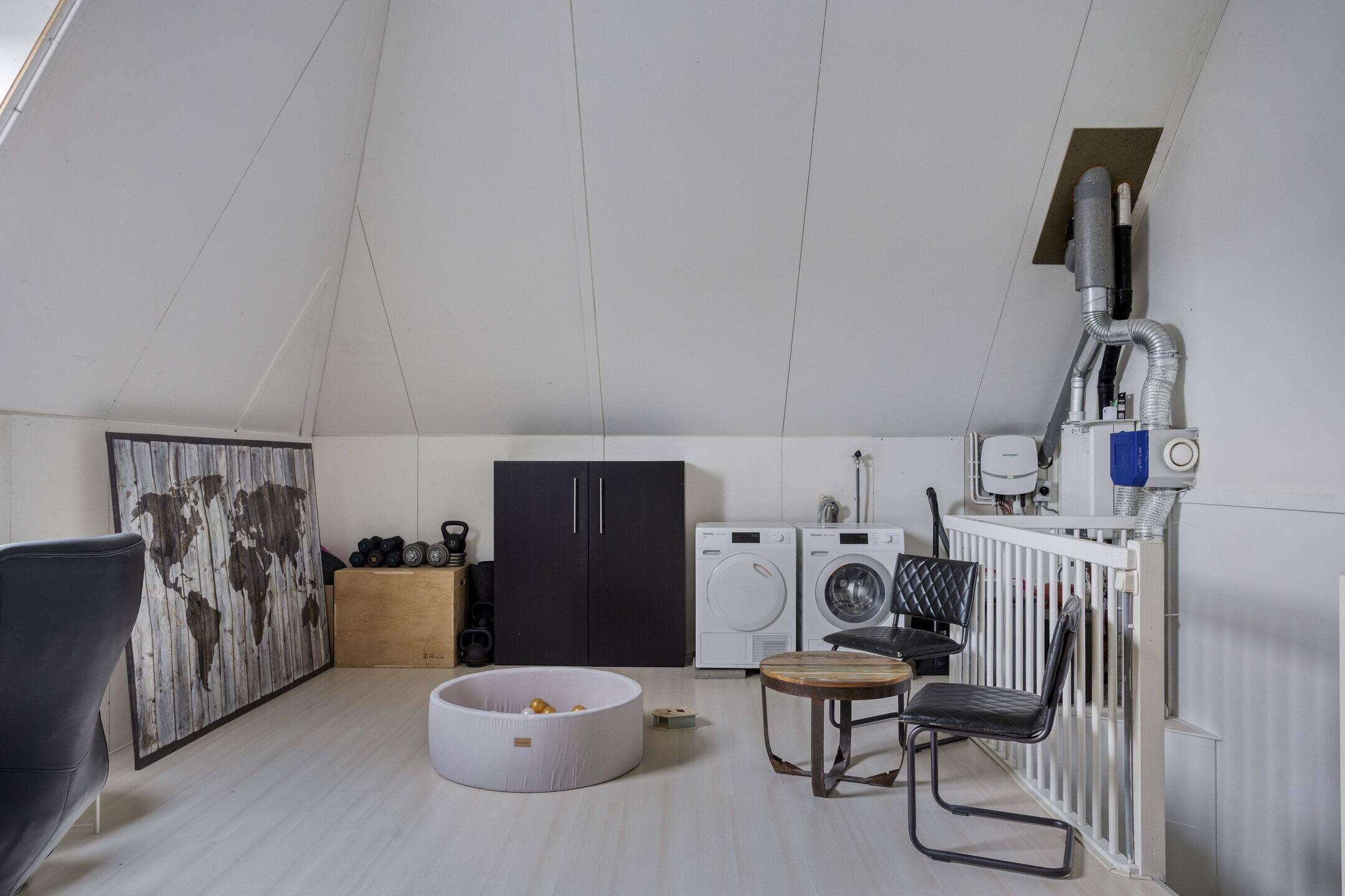 De tweede verdieping is een royale multifunctionele ruimte met een indrukwekkende nokhoogte van ca. 4,90 meter. Ideaal om extra (slaap)kamers, een werkruimte of hobbykamer te realiseren. Daarnaast bevindt zich hier ook de opstelplaats voor Cv-ketel (Intergas, 2010), wasmachine, droger en mechanische ventilatie box en is de ruimte voorzien van dakvenster met verduisteringsscherm, nette laminaatvloer en diepe knieschotten voor bergruimte.