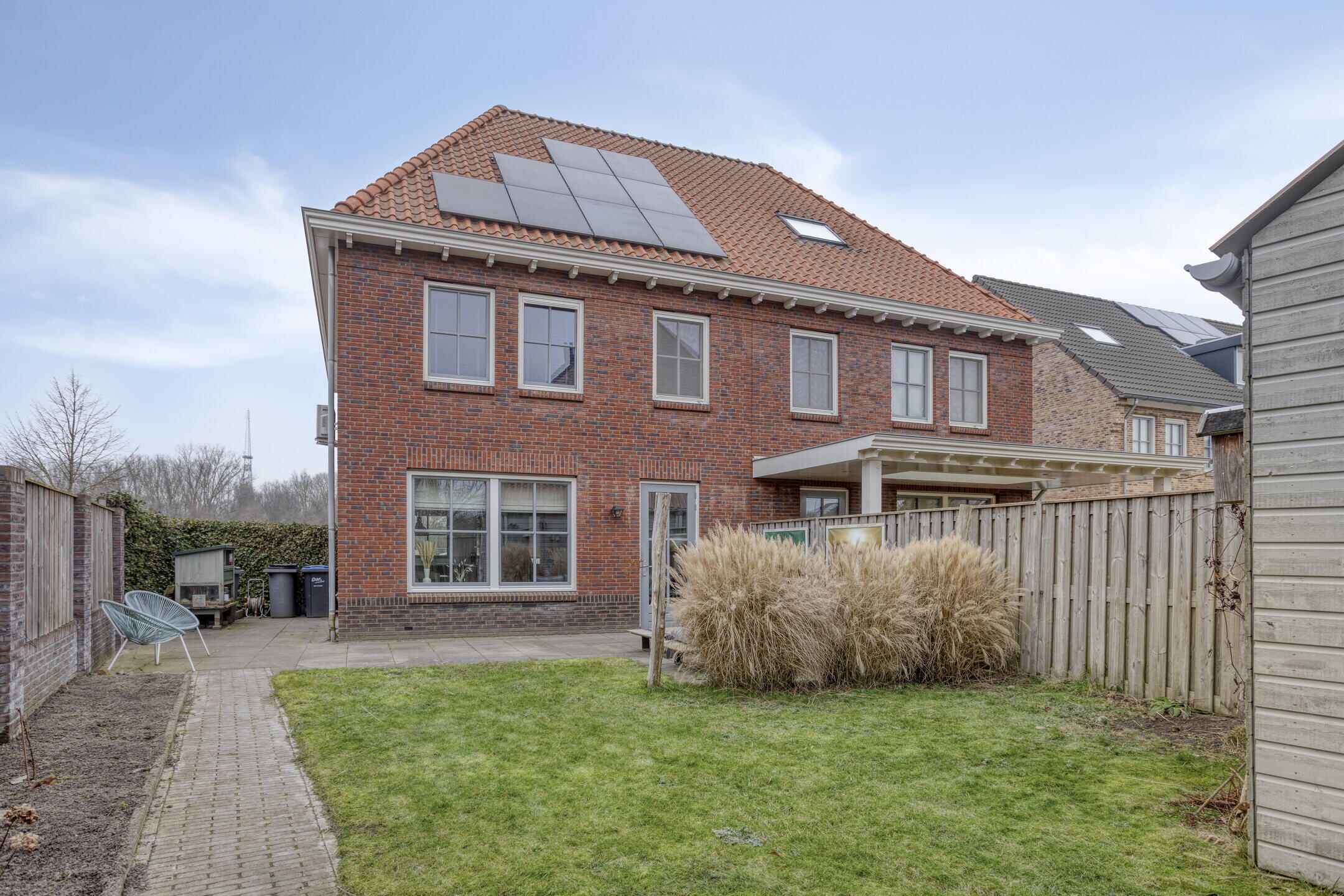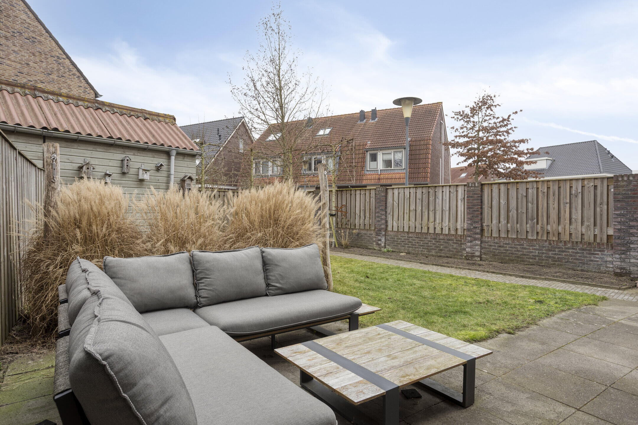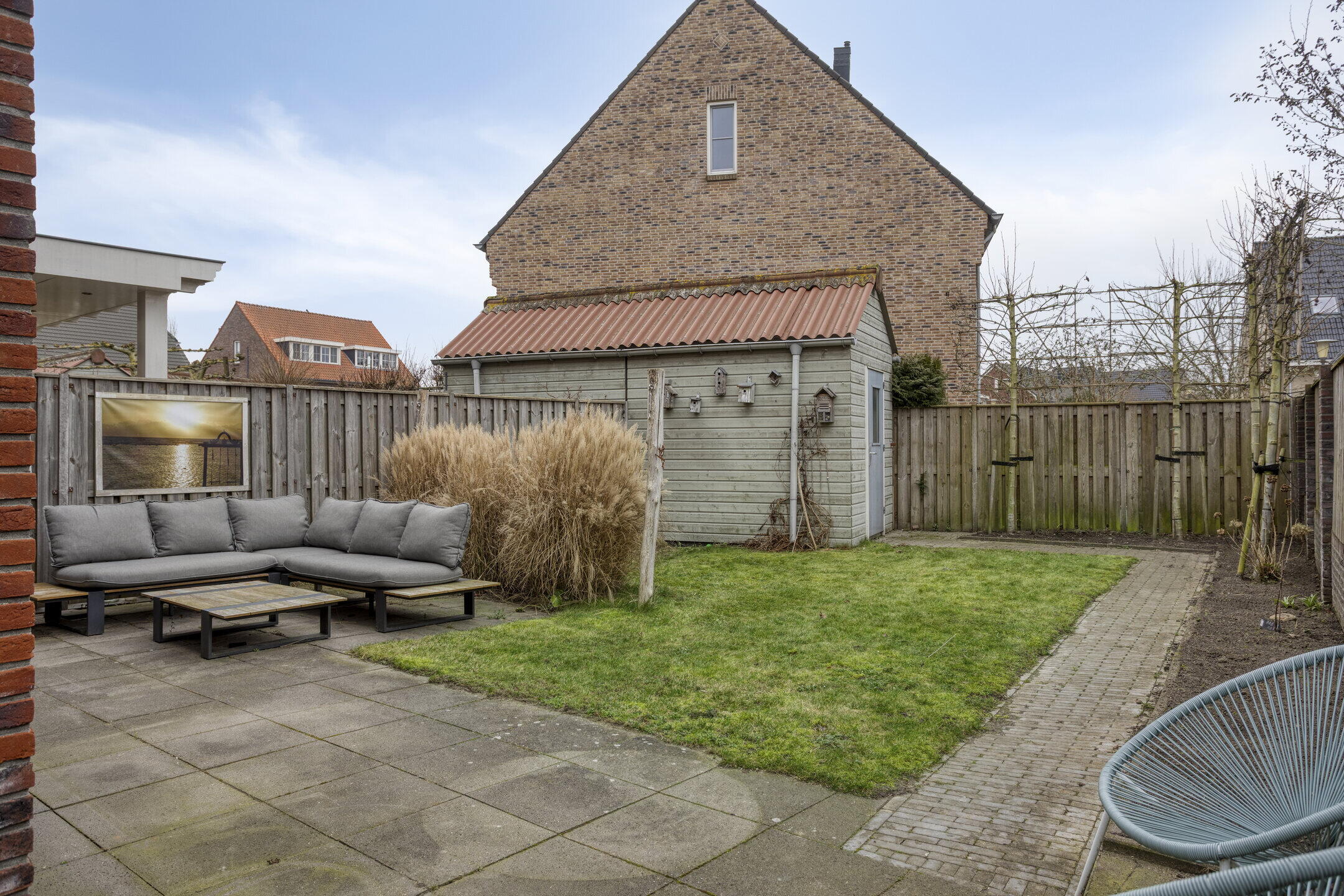 De achtertuin is groen, sfeervol en uitnodigend aangelegd en vormt een fijne verlenging van de woning. Het gezellige terras nodigt uit tot ontspannen momenten, terwijl het gazon en het omliggende groen zorgen voor een rustige, natuurlijke uitstraling. Dankzij de volledig omsloten ligging, de houten erfafscheidingen geniet je hier van veel privacy en vrijwel geen inkijk. Bovendien biedt het gazon een fijne plek voor kinderen om te spelen. Achter in de tuin staat een praktische berging, ideaal voor fietsen en tuingereedschap.
